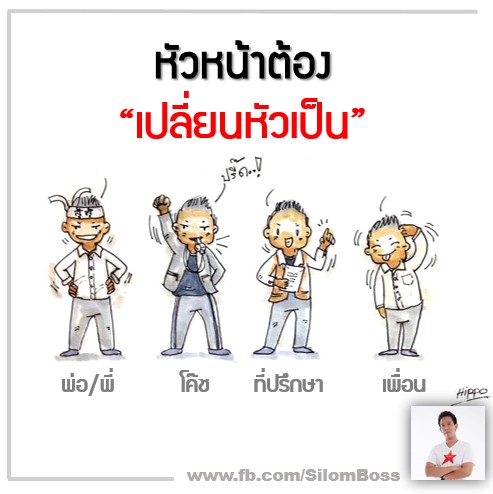 เกิดเป็นหัวหน้าต้องรู้จักเปลี่ยนหัวให้เป็นครับ ไม่ใช่แค่ใส่หัวโขนเป็นแต่หัวหน้าอย่างเดียว คุณจะลำบากมาก จะเป็นหัวหน้าให้รุ่ง คุณต้องเปลี่ยนบทบาทให้ได้ไม่ว่าจะเป็น พ่อ พี่ เพื่อน โค๊ช หรือที่ปรึกษา